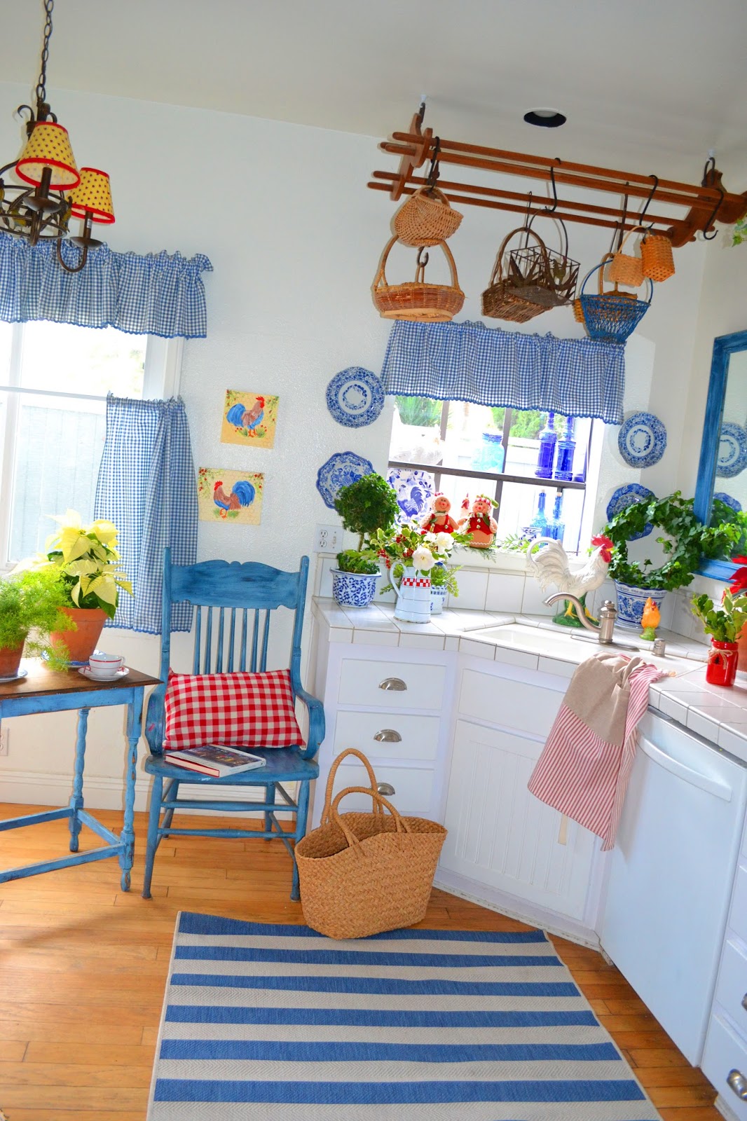 Two of my little Rooster paintings are on the wall. I have fun painting my personal art to match my decor! Roosters rule in my kitchen thus the Rooster art! The blue chair is a favorite place to sit and read with a cup of tea as it gets the morning sun.