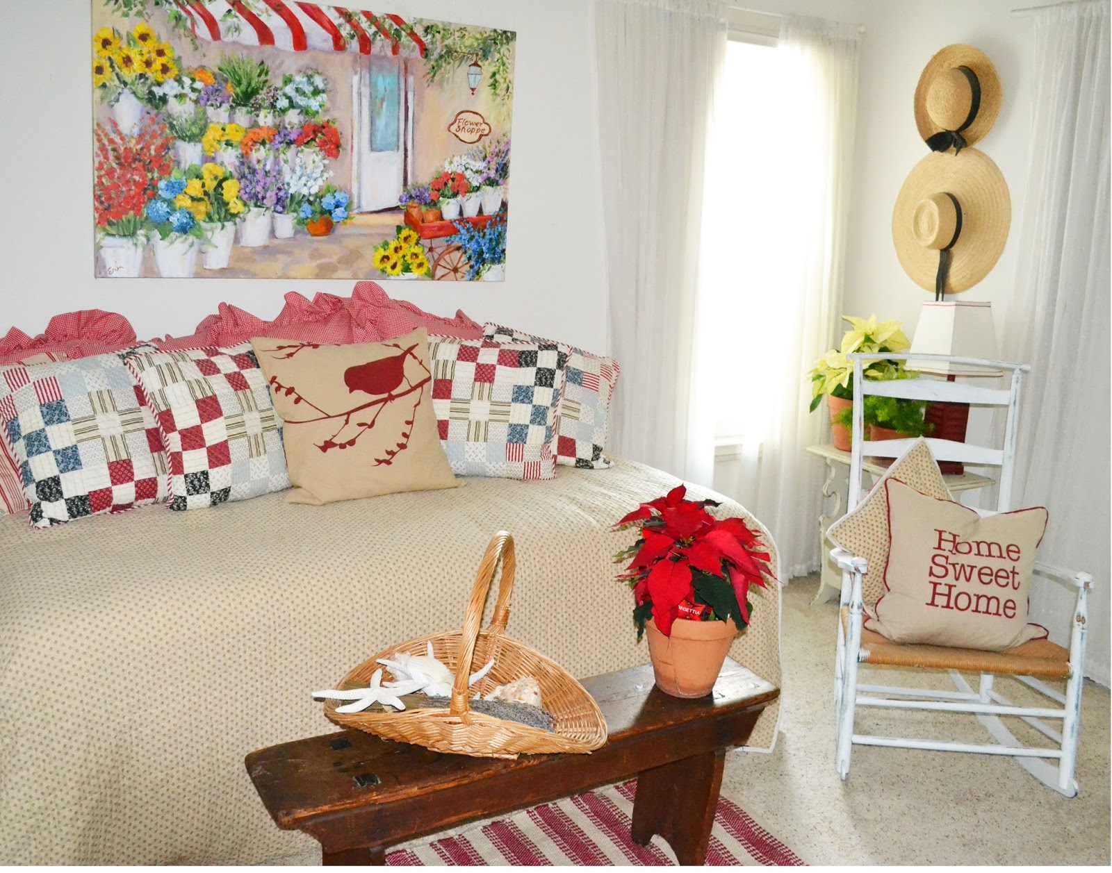 My office and bedrooms are upstairs. The large Flower Shoppe painting hangs in my office that is a loft room over looking the living room and side garden. I like to mix old painted furniture with primitive wood antiques as the unpainted wood tends to anchor the room.
