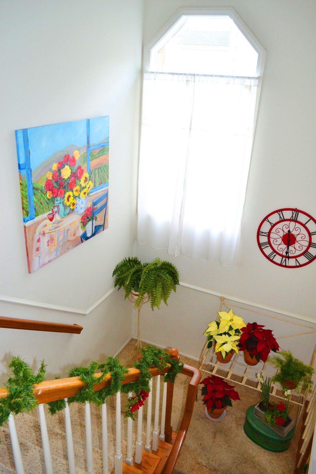 The staircase has a lovely landing with a tall window that lets in lots of light and is a great place to grow ferns and Christmas plants as well as hang one of my large paintings of a California vineyard.