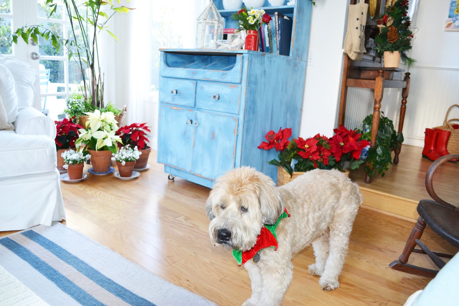 The painted blue table is on of my favorites and displays a little Christmas painting of my red front door and Bentley. The mirror behind the table reflects the outdoors.