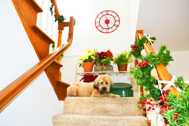 The landing is also one of Bentley's favorite places to hang out. Simple green garlands with red berries and sea shells are wrapped around the banisters.