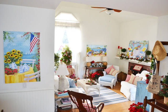Welcome. I am so happy that you stopped by. I generally share my garden and the inspirations for my paintings with you. This year I was so honored that Cottages and Bungalows magazine shared my home in their Easy Seaside Style issue and have requests from some of their readers to have a peek inside my cottage to see how I decorate for Christmas with my art. So . . . . . I decided to re-post and update a previous Christmas home tour. My front door is always open for you to come in and sip a cup of tea while I share with you my painted cottage.