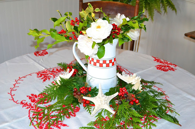 I like to keep Christmas decoration simple using greens, berries and seas shells in keeping with my coastal cottage style of decorating. I collect vintage table cloths and have several lovely ones with reds that I save to use at Christmas time.